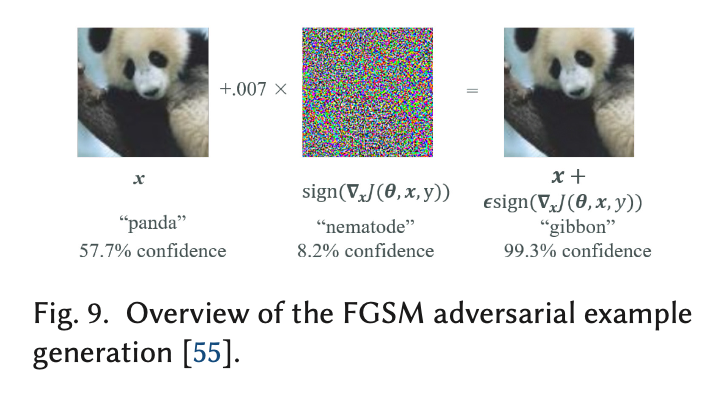 adversarial example(적대적 샘플) 은 AI 를 공부하는 사람이라면 익히 들어봤을 법 하다. 현재 가장 연구가 활발히 되고 있는 AI 관련 보안 이슈이기 때문이다. adversarial example 은 이미 완성된 모델을 이용해 결과를 추론하는 과정에서 나타난다. 즉, 깨끗한 인풋(input) 데이터에 사람이 인식 불가능한 노이즈(noise)를 추가 시켜서 전혀 틀린 결과(output)가 나오도록 하는 것이다. 해당 공격 관련한 기법으로 유명한 Goodfellow 아저씨가 참여하신 FGSM adversarial example 기법이 있다. [4] 이는 이미지 분야에서 대표적인 adversarial example 생성 알고리즘이다. 이런 이미지 분야 말고도 자연어 처리, 음성 인식, 악성 코드 인식 (malware detection) 과 같은 분야에서도 많은 연구가 진행 중이다.