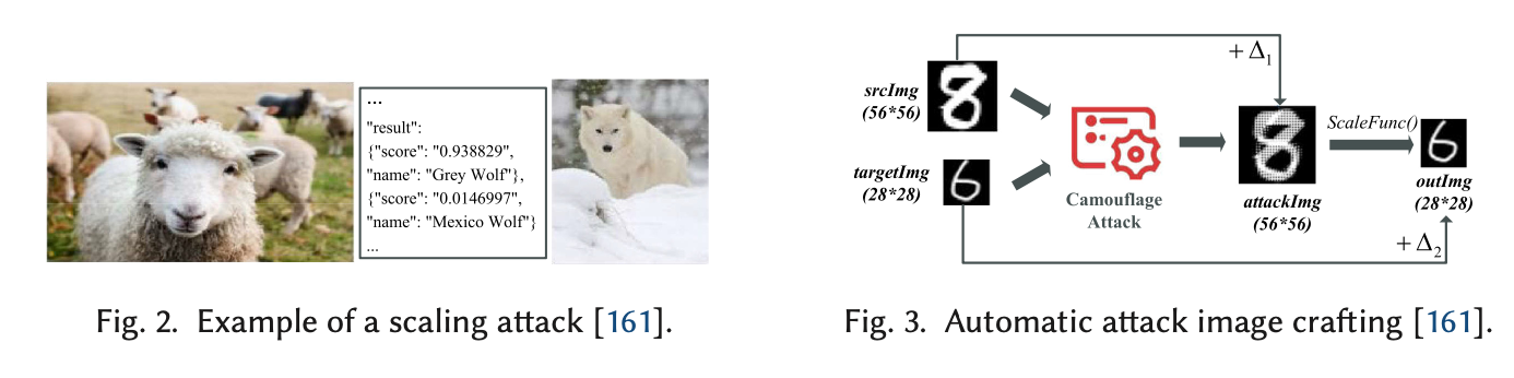 이미지 관련 인공지능 모델은 보통 해당 모델의 인풋(input)으로 들어가는 이미지의 크기가 정해져 있다. 32x32 나 224x224 크기 정도의 이미지들이 통상적인 인풋 크기로 많이 쓰인다. 그렇기 때문에 일상에서 생겨나는 이미지는 이 모델의 인풋 사이즈에 맞춰질 필요가 있다. 이를 위해 data pre-processing (데이터 전처리) 과정에서는 이미지 scaling (스케일링) 작업을 진행한다. 이 과정에서도 원래의 데이터가 위협 받을 수 있다. 보통의 이미지 스케일링 알고리즘을 악용해서 위장 이미지를 만들어서 원래의 정답과 다른 정답이 나오도록 하는 것이다. 예로, 늑대의 사진을 받아서 특수한 스케일링 작업을 진행해, 시각적으로 양과 비슷한 이미지를 만들고 이를 인풋으로 넣어 동물 분류 모델의 결과(output)가 ‘양’이 나오게 한다. 이 인풋을 다시 원래의 사이즈로 re-scaling을 하면 원래의 늑대 사진이 그대로 나온다. 이러한 스케일링 공격은 공격 대상 모델의 정보를 알지 못해도 공격 시도가 가능하다. 이를 black-box 공격이라고 한다. 이것이 가능한 이유는 모델에 사용되는 이미지 사이즈, 리스케일링(rescaling) 알고리즘들이 매우 한정되어 있기 때문이다. 따라서, 모델의 직접적인 정보를 알지 못해도 한정적인 기법들을 유추함으로써 스케일링 공격을 시도할 수 있다.