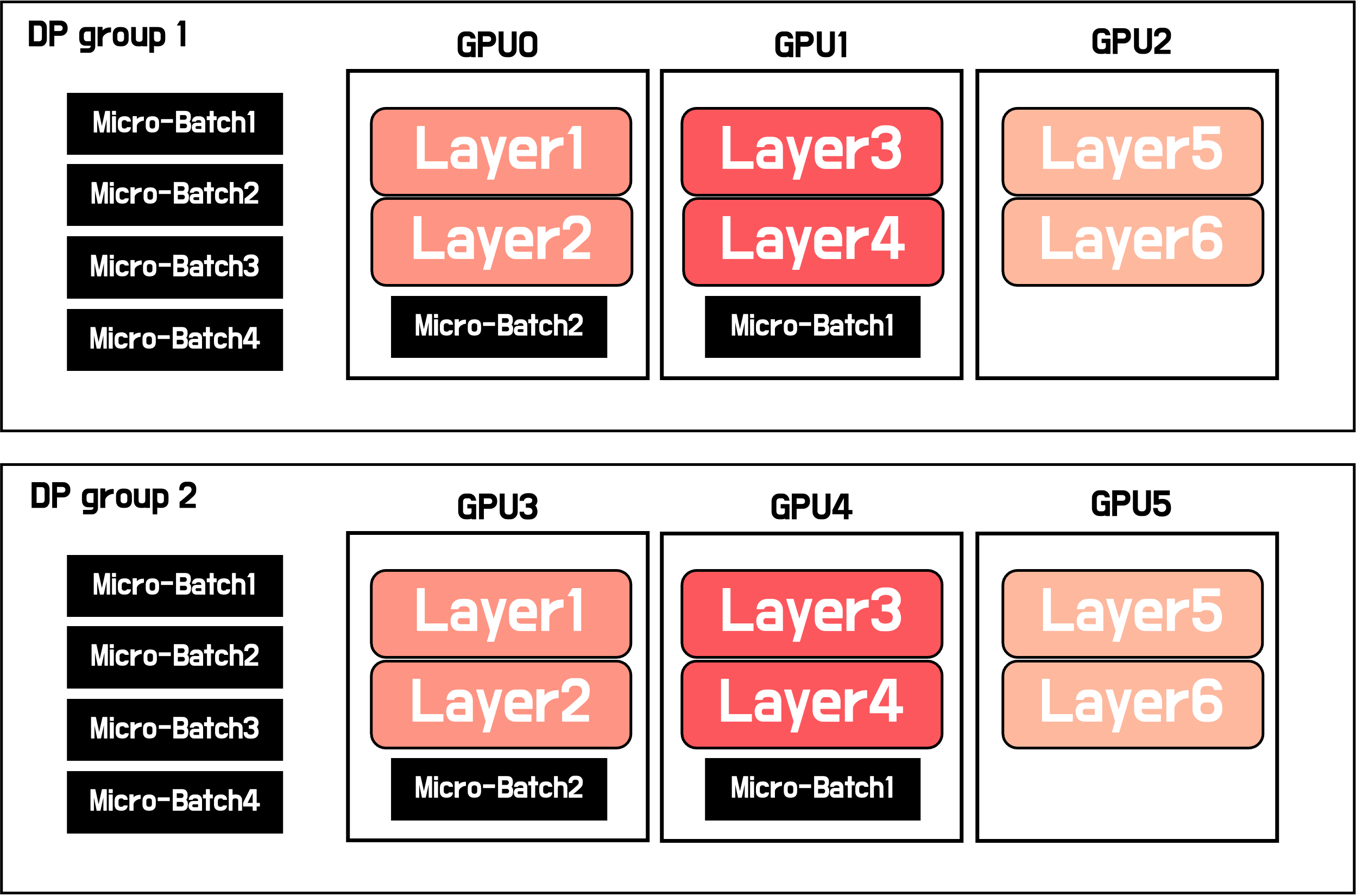 - Pipeline Parallelism : 모델을 layer-wise 로 분할해서 각 Layer 를 GPU에 할당한 뒤, batch 를 micro-batch 로 나눠 각 gpu 가 병렬적으로 batch 계산을 수행하는 것