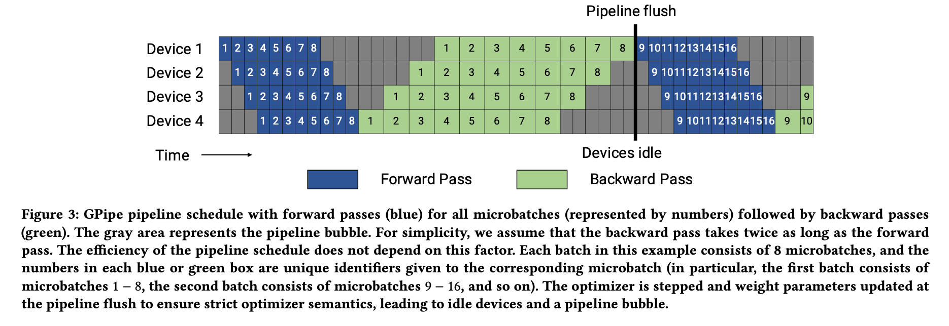 그렇게 되면, GPU0이 micro-batch1을 layer1~2 를 계산하고 계산된 값을 GPU1 으로 전달해서 GPU1이 micro-batch1 을 layer3~4에 대해 계산할 땐, GPU0 은 동시에 놀지 않고 micro-batch2 에 대해서 계산을 처리하는 것이다. 이를 통해 각 GPU 들의 노는 시간(idle time)을 줄이는 것이다.