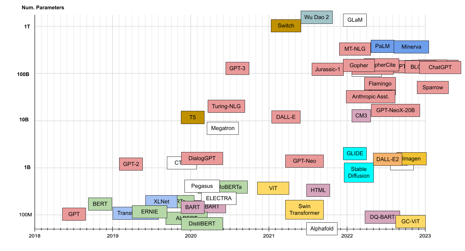 2023년도 초반인 현재 ChatGPT 는 장안의 화제이다. 언어의 대한 이해 뿐 아니라 개발자들의 코드를 수정해주는 등 엄청난 품질로 사람들을 놀래키고 있다. ChatGPT 는 GPT3 라는 딥러닝 모델 구조 기반이다. GPT3 는 175billion (약 1750억개) 의 parameter 를 가지고 있는 모델이다. 매우 거대한 모델이라고 할 수 있다. GPT 뿐 아니라 BERT, T5 등 다양한 거대 언어 모델 (Large Language Model) 들이 있다. 아래 그림을 보면 2021 년 이후로는 1 Trillion (1조개) 를 넘어가는 초초거대 모델이 등장할 정도로 모델의 사이즈는 점점 커지고 있는 추세다.