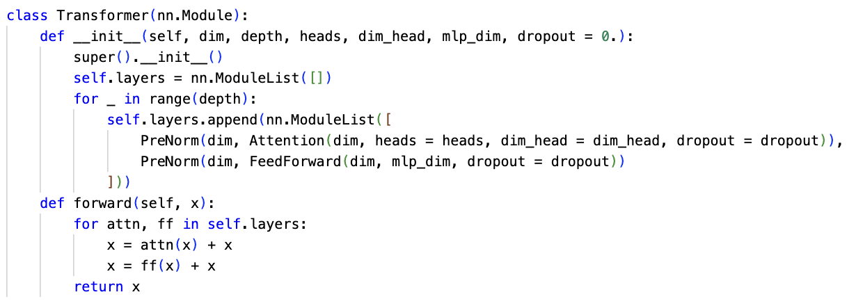 Pytorch 로 구현한 Transformer block 의 코드는 아래 이미지와 같다.
