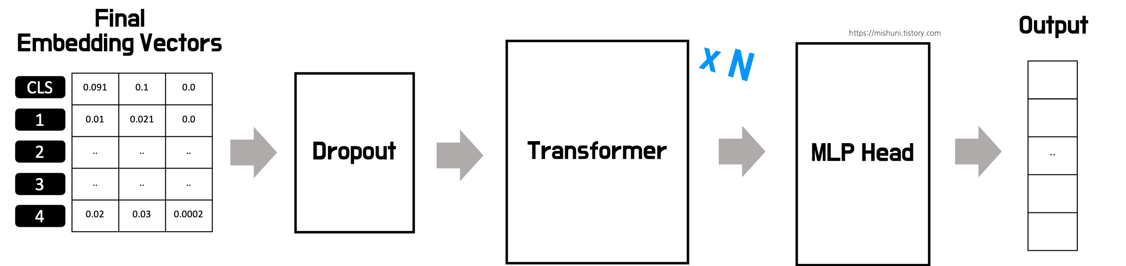 자 그래서 위에서 생성된 Final Embedding Vectors 들은 Dropout 에 지나가고 다음 Transformer Block 여러개를 지난 후에 최종적으로 MLP head 을 지나 최종 classification output 이 나온다.