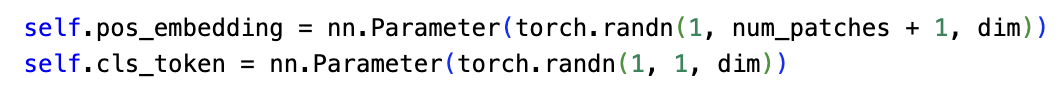 위에서 말한 position embedding 와 CLS token 은 위 코드와 같이 pytorch 의 Parameter Class 를 이용해서 training 즉, 훈련 가능하도록 정의한다.