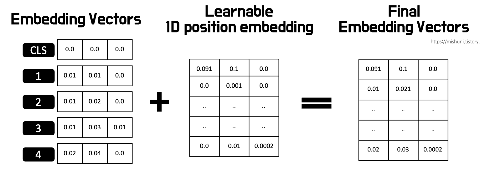 여기서, 기존 patch 4개들에 처음 자리에 추가적으로 CLS 라는 역시나 훈련 가능한 patch embedding 을 붙인다. 그래서 위 그림에 embedding vectors 들이 5개로 표현되어 있다.
