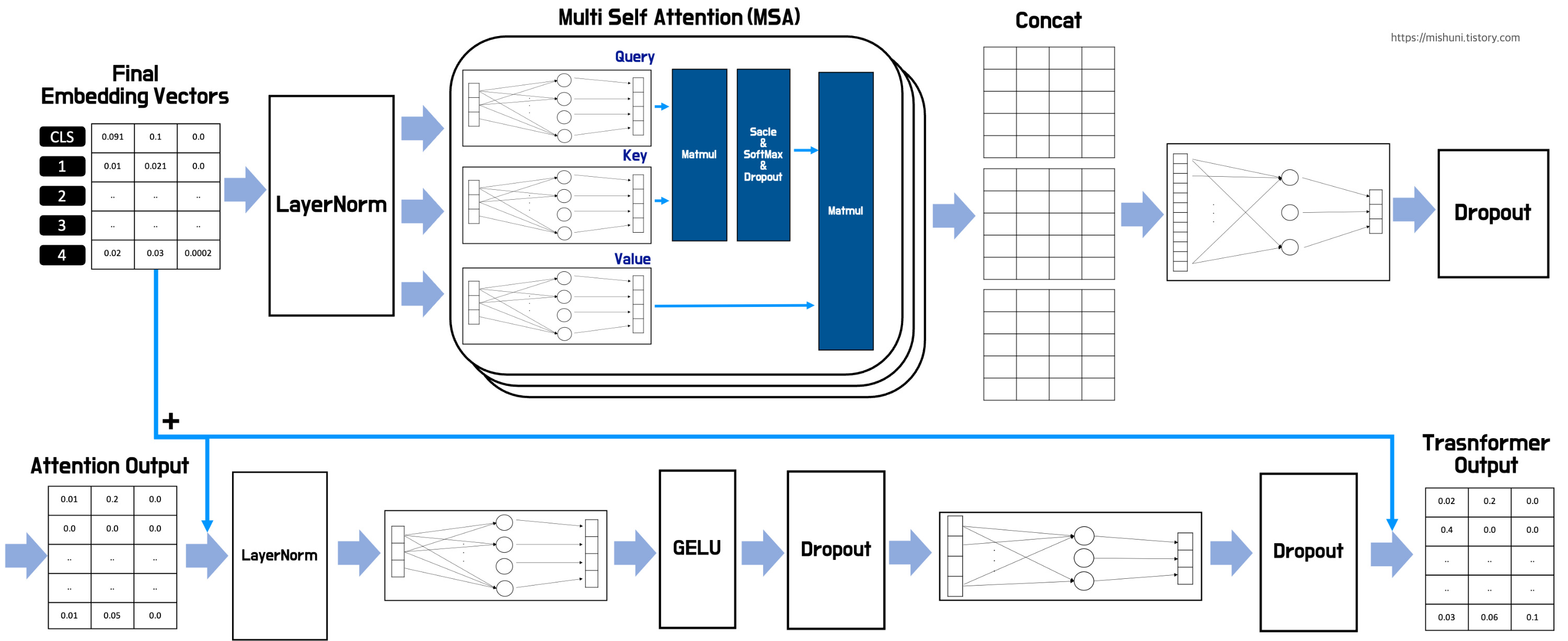 후로, 이제 MLP block 을 거치게 된다. 5x3 Attention output 이 LayerNorm 지나고 또 Linear Layer 에 들어간다. 여기서 MLP_dimension 은 4로 표현했다. 그래서 해당 Linear Layer 를 거쳐 5x4 로 생성되고, GELU + Dropout 을 지나고 다시 Linear Layer 를 통해 5x3 의 matrix 로 돌아온다. 그리고 최종적으로 Dropout 을 거쳐 Transformer 의 Output 이 출력된다.