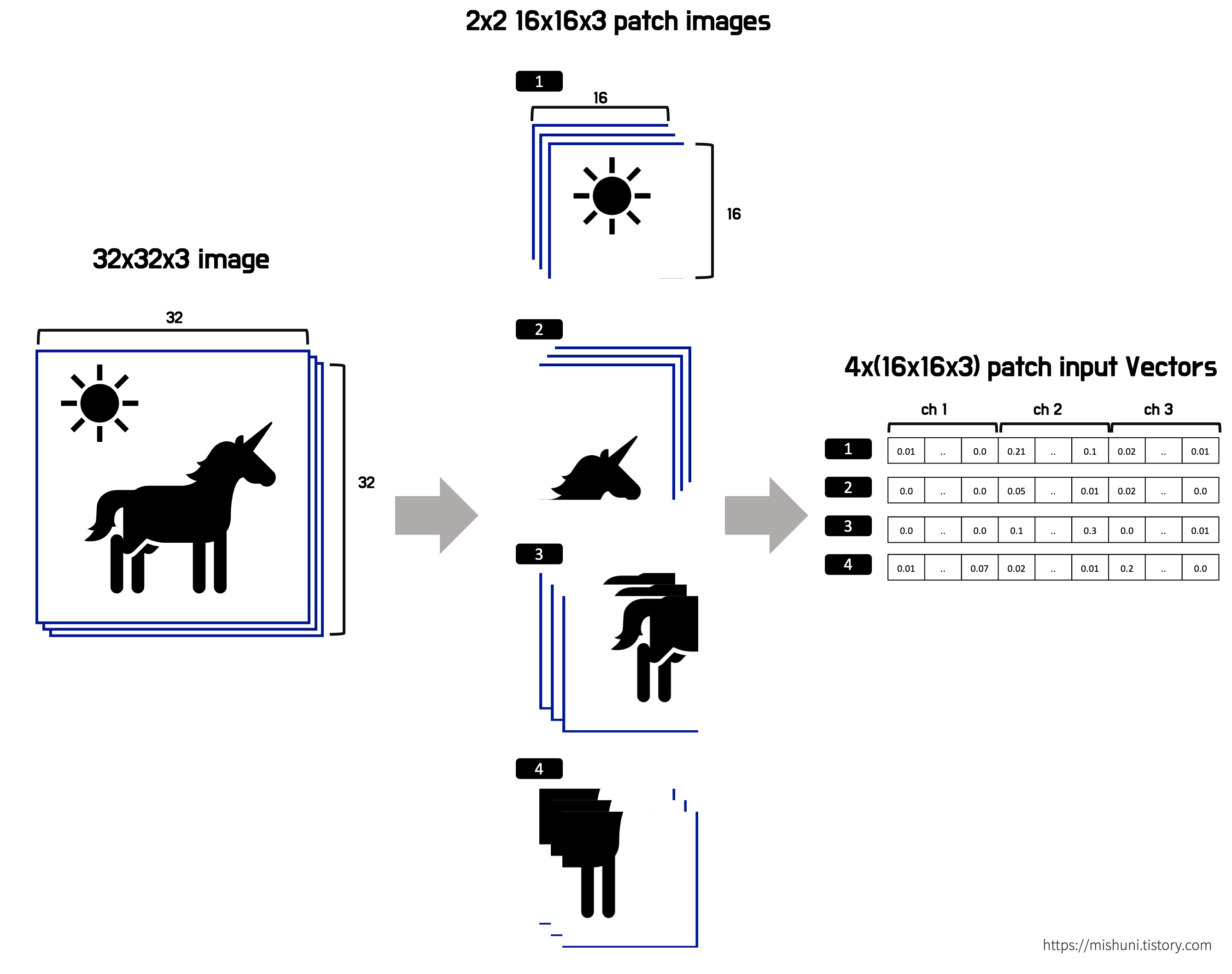 ViT 에 들어가는 이미지는 32x32x3 의 1장이고 Patch size 는 16 이다.
