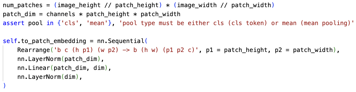 [2] 는 ViT 를 Pytorch 로 구현한 코드 인데, 위 부분은 그 중 Patch embedding 부분을 code 로 구현한 것이다. Rearrange 를 통해 1개의 (b=1) 1x3x32x32 이미지를 -> 1x(2*2)x(16*16*3) = 1x4x768 로 바꾼다. 그리고 Layernorm -> Linear Layer -> LayerNorm 을 지나면서 1x4x3 (dim=3) embedding vector 를 추출하는 것을 볼 수 있다.