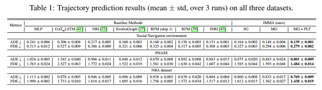 Table 1 을 통해, Social Navigation Environment, PHASE, NBA 세 가지 데이터에서 IMMA with PLT 가 ADE 와 FDE 둘 다 에서 가장 낮은 값을 기록하므로, 다른 baseline 들의 비해 향상된 성능을 보임을 알 수 있다.