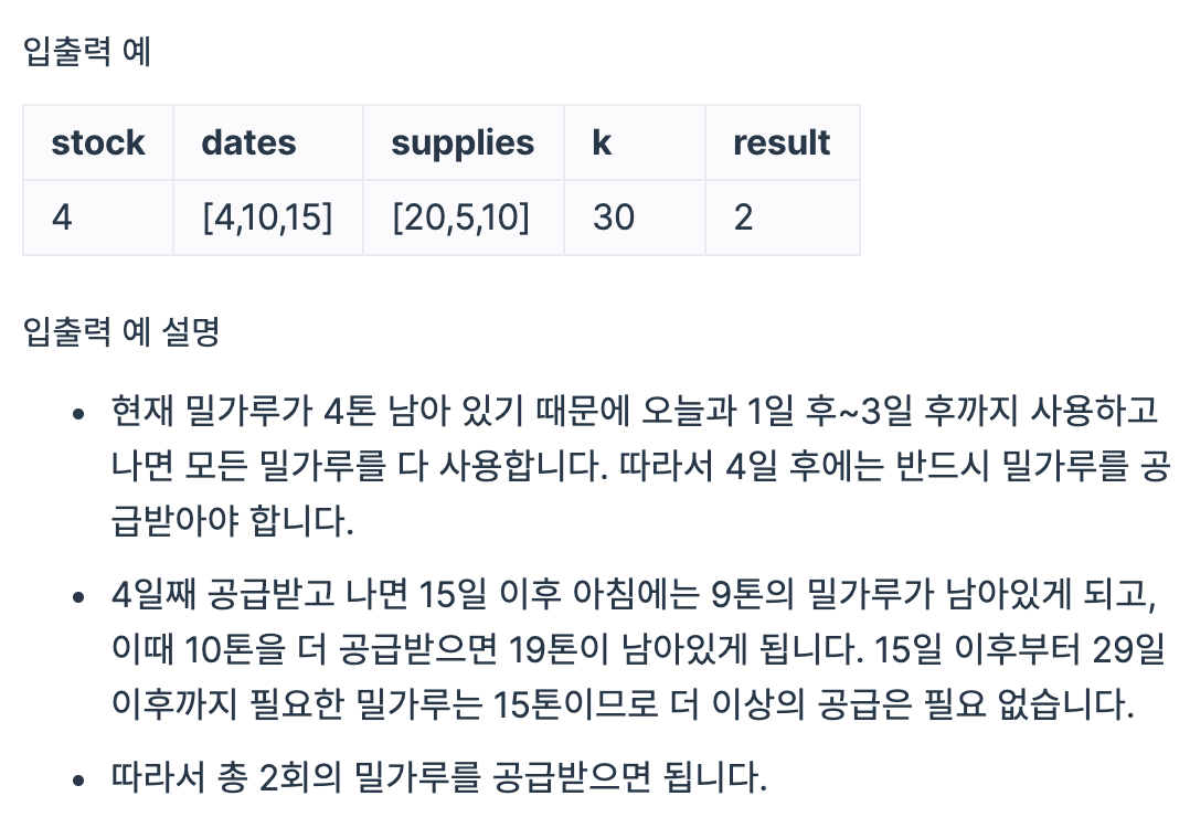 라면 공장에서는 하루에 밀가루를 1톤씩 사용합니다. 원래 밀가루를 공급받던 공장의 고장으로 앞으로 k일 이후에야 밀가루를 공급받을 수 있기 때문에 해외 공장에서 밀가루를 수입해야 합니다. 해외 공장에서는 향후 밀가루를 공급할 수 있는 날짜와 수량을 알려주었고, 라면 공장에서는 운송비를 줄이기 위해 최소한의 횟수로 밀가루를 공급받고 싶습니다. 현재 공장에 남아있는 밀가루 수량 stock, 밀가루 공급 일정(dates)과 해당 시점에 공급 가능한 밀가루 수량