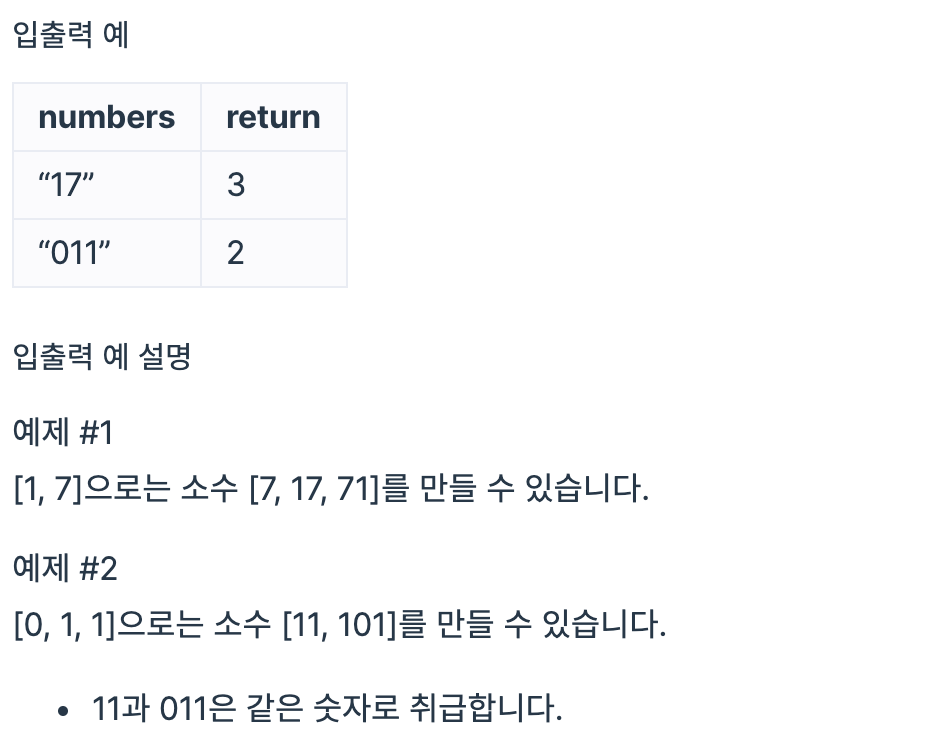 한자리 숫자가 적힌 종이 조각이 흩어져있습니다. 흩어진 종이 조각을 붙여 소수를 몇 개 만들 수 있는지 알아내려 합니다. 각 종이 조각에 적힌 숫자가 적힌 문자열 numbers가 주어졌을 때, 종이 조각으로 만들 수 있는 소수가 몇 개인지 return 하도록 solution 함수를 완성해주세요. 제한사항 numbers는 길이 1 이상 7 이하인 문자열입니다. numbers는 0~9까지 숫자만으로 이루어져 있습니다. 013은 0, 1, 3 숫자가 적힌 종이
