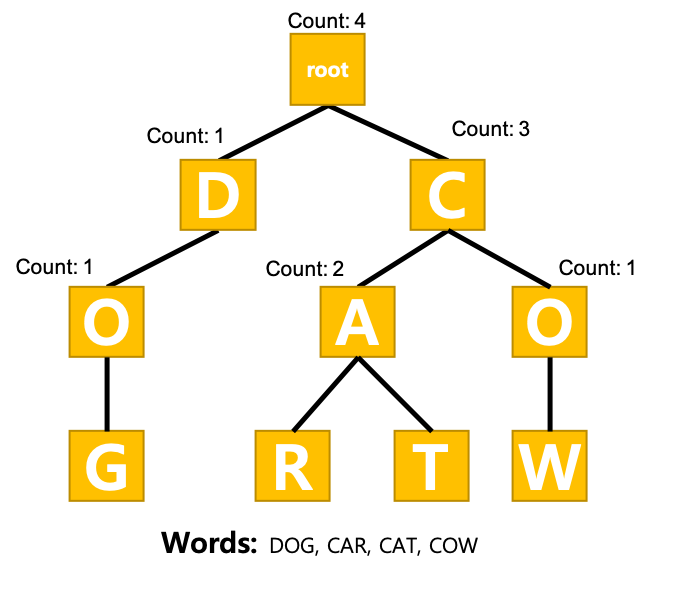 여기서 Trie 구조란 ? 문자열에 특화된 트리 구조로, 문자 하나씩 깊이가 추가되는 구조인데 그림으로 보면 아래와 같습니다.