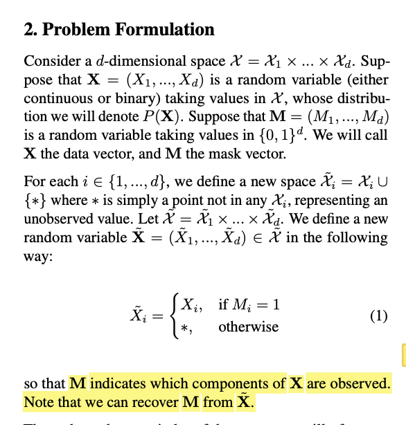 위 그림과 같이 해당 논문에서 mask vector M을 사용하여 관측된 데이터와 그렇지 않은 데이터를 나타낸다.
